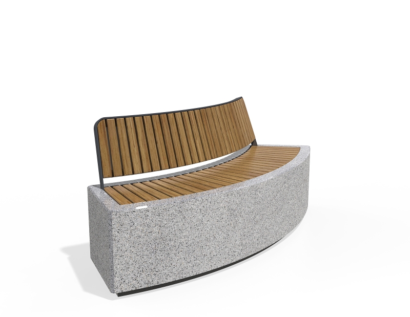 The 268-G bench model is made from high-strength fiber-reinforced concrete with a homogeneous structure of natural marble or granite stones. The structural aggregates are precisely sized and come in various color combinations, setting the main textures: white, scatter, gray, or brown. The stylishly curved form combined with the delicate relief of the embosed surface is complemented by the natural warmth of the wood. The metal components making up the seat and back of the bench are made of stainless steel. The seat and backrest are made of premium wood, available in two options: spruce or eco-friendly Resysta® wood. Developed in Germany, this innovative material is 100% recyclable and eco-friendly, offering a 15-year warranty against cracking and delamination (provided by the manufacturer). The treatment of the wooden elements and the concrete surface with protective coatings provides additional resistance to atmospheric influences. Thanks to the curved form of the bench, a circle with an outer diameter of 4 meters can be described when combining 6 modules of the same type or with other curved modules from the 268 series. The 268-G concrete bench can be used both independently and in combination with other modules of the model, offering various solutions for creating beautiful and functional park spaces.